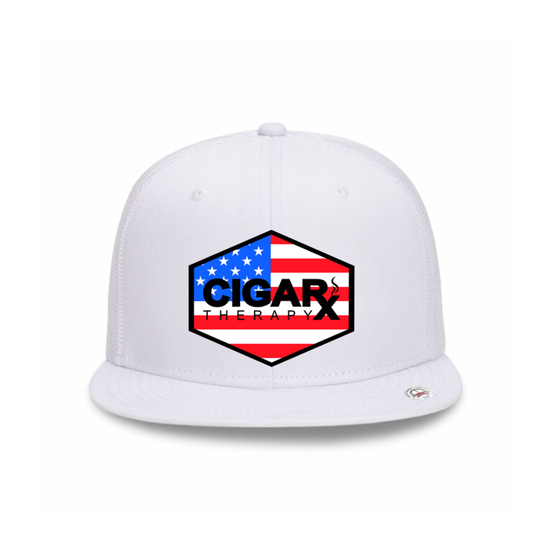 The White Flat Trucker with USA Flag Patch is a salute to culture, confidence, and cigars that burn long. Crisp white panels carry the bold flag patch, making it the go-to cap for aficiondos who smoke with pride.